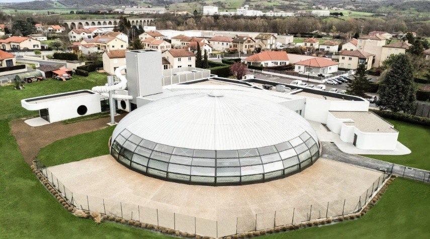 La piscine Tournesol d’Aquadôme à Langeac, bâtiment emblématique au dôme caractéristique, nécessitait une rénovation complète pour répondre aux exigences modernes tout en préservant son identité architecturale. BC Auvergne Rhône-Alpes a apporté son expertise sur la structure métallique, la couverture et la verrière, en collaboration avec les filiales du groupe Baudin Chateauneuf :